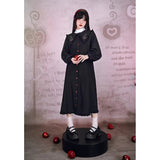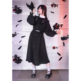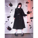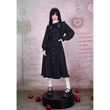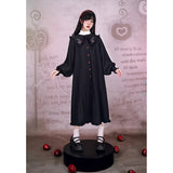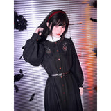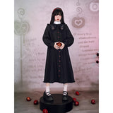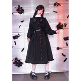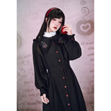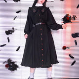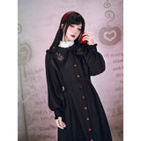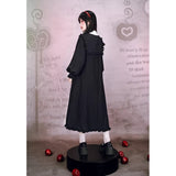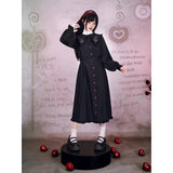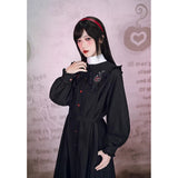 “禁断の果実”というダークフェアリーテイルの世界観をイメージしたワンピース。赤いボタンは、林檎の実や滴る果汁を思わせるアクセントとなり、襟部分には小さな林檎の刺繍があしらわれ、物語の象徴を静かに語ります。フリルを縁取った襟元と、ふんわりとしたパフスリーブはクラシカルで無垢な印象を与えながら、黒と赤のコントラストが“純粋さと罪”という対立するテーマを浮かび上がらせています。