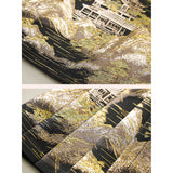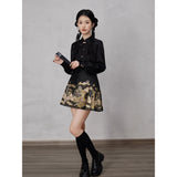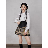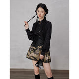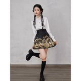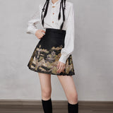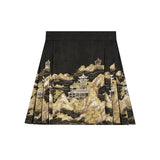 黒地にきらびやかな金糸で山水画のような風景が織り込まれた、雅やかで幻想的なプリーツスカート。高めのウエスト位置で締められ、プリーツがふんわりと広がることで、気品と可憐さを両立させています。描かれた楼閣や山々は、まるで物語の一場面のようで、クラシカルな美と現代的な可愛らしさを兼ね備えています。