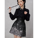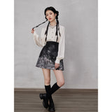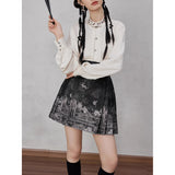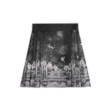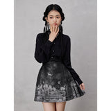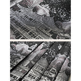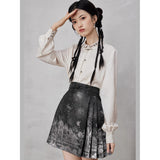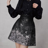 黒地に銀糸で繊細な建築風景と飛翔する鳥たちが描かれたプリーツスカート。空に舞う鳥や、幻想的に広がる建物群が、まるで夜空に浮かぶ夢の都を表現しているような印象を与えます。繊細な柄が全体に広がりつつも、裾に向かって物語を描くように展開されており、詩的で幻想的なムードを纏った一着。