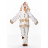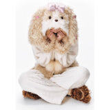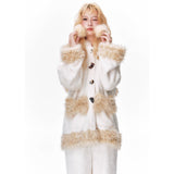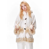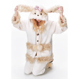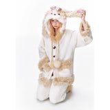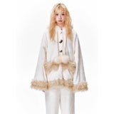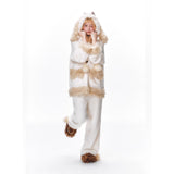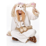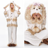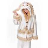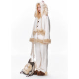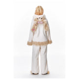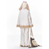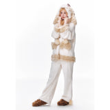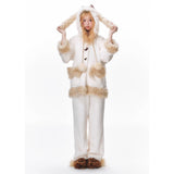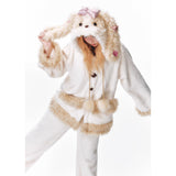 まるで絵本の世界から抜け出したような、ドリーミーなナイトタイムを演出するルームウェア。ぬいぐるみのような愛らしさと、包み込まれるような暖かさを兼ね備えたふわもこセットアップ。ふわふわのファーがたっぷりとあしらわれたフードには、長い耳がついており、キュートなリボンを結んだぬいぐるみのモチーフがデザインされています。