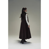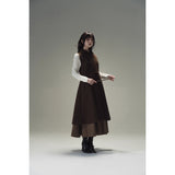 古代文献を守る司書、あるいは魔術学院の教授のような、クラシカルで端正な佇まいのケープとノースリーブコート。深みのある焦茶のケープは、古書の革装丁のように静かで重厚。同色のノースリーブコートは構築的なシルエットで、上品な均衡を描きます。知性と静謐を纏って世界へ誘われてみて。