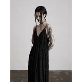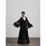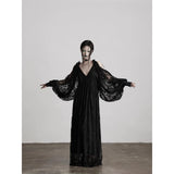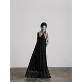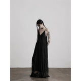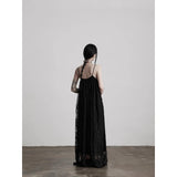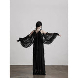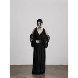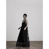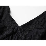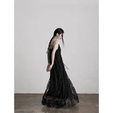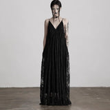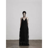 繊細な総レースが全体を覆う、透け感と揺れ感が美しいブラックキャミソールワンピース。深めのVネックと華奢なストラップがデコルテを引き立て、退廃的でゴシックなムードを纏った一着。歩くたびに軽やかに揺れるレースが、静かな存在感と儚さを演出します。
