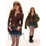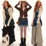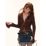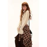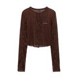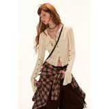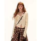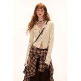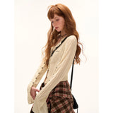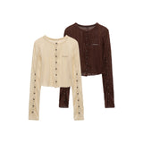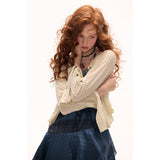 細かな縦プリーツとフリルをあしらった、透け感のあるフィットシルエットのカーディガン。前立てから袖口にかけて並ぶ小ぶりなボタンがアクセントになり、袖のスリットとフレア感が手元を軽やかに演出します。胸元には控えめなブランドロゴが施され、羽織りとしても、トップスとしても着こなせるデザインです。