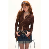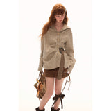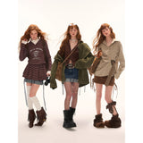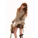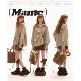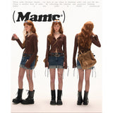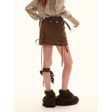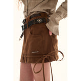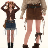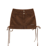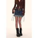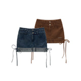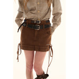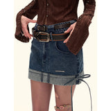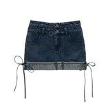ベルトを二連通すことのできるデザインが特徴的なショート丈のデニムスカート。裾を折り返したようなデザインに加え、両サイドに結び紐のディテールがあり、カジュアルさの中に遊び心を感じさせます。フロントにはポケットが付いています。どこかヴィンテージ感のある雰囲気で、ストリートやカジュアルスタイルに映える一着。