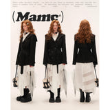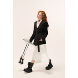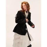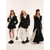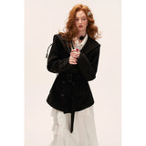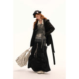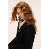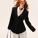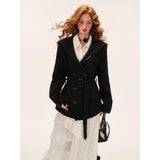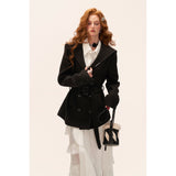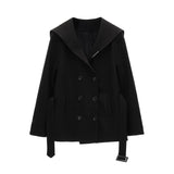 深みのあるブラックで仕立てられたダブルブレストのジャケット。大きめのセーラーカラーが存在感を放ち、直線的なシルエットに立体感を与えています。フロントは二列のボタンで留められ、同素材のベルトでウエストを締めることで、クラシックでありながらもモードな印象を演出。袖口のボタンやすっきりとしたポケットが程よいディテールを加え、全体に洗練された雰囲気を漂わせています。力強さと気品を併せ持つ、都会的でモダンなアイテム。
