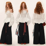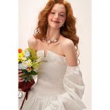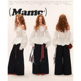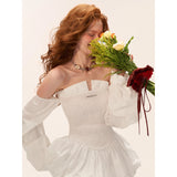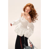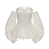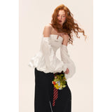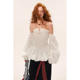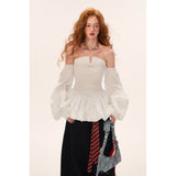 ホワイトのストライプ柄を基調とした、オフショルダーのロマンティックなトップス。身頃は細かなシャーリングでフィット感を出し、裾にかけてふんわりと広がるペプラムシルエットが女性らしい印象を演出。ボリュームたっぷりの長袖は肩から落ちたデザインで、クラシックとモダンが融合した華やかな一枚。