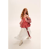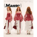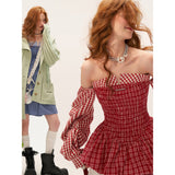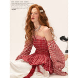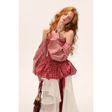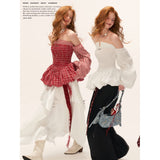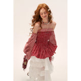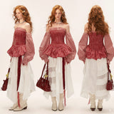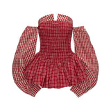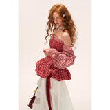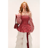 レッドのチェック柄を基調とした、オフショルダーのロマンティックなトップス。身頃は細かなシャーリングでフィット感を出し、裾にかけてふんわりと広がるペプラムシルエットが女性らしい印象を演出。ボリュームたっぷりの長袖は肩から落ちたデザインで、クラシックとモダンが融合した華やかな一枚。