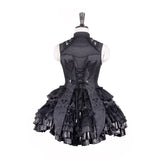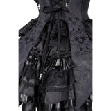 闇の大聖堂に棲む“堕天の貴族”を思わせる世界観をイメージして仕立てられたお洋服。トップスは、コルセットのように身体を引き締める構築的なラインと、フロントに走る差し色が、封印された魔力の心臓を思わせるデザイン。背面のレースアップと取り外し可能な翼パーツは、堕天使や悪魔の象徴を彷彿とさせ、静かな反逆と気高い孤独を表現しています。繊細な刺繍には悪魔と蜘蛛の巣を思わせるモチーフが広がり、闇に瞬く星や禁断の契約を象徴するかのような神秘性を帯びています。スカートは幾重にも重なるブラックフリルと光沢素材が重厚なボリュームを生んでいます。レースをたっぷりと使った長いトレーンは、古城の石床を静かに引きずる夜のヴェールのようで、祈りと呪いが交差する礼拝堂の空気を感じさせます。