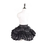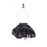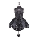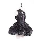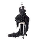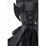 闇の大聖堂に棲む“堕天の貴族”を思わせる世界観をイメージして仕立てられたお洋服。トップスは、コルセットのように身体を引き締める構築的なラインと、フロントに走る差し色が、封印された魔力の心臓を思わせるデザイン。背面のレースアップと取り外し可能な翼パーツは、堕天使や悪魔の象徴を彷彿とさせ、静かな反逆と気高い孤独を表現しています。繊細な刺繍には悪魔と蜘蛛の巣を思わせるモチーフが広がり、闇に瞬く星や禁断の契約を象徴するかのような神秘性を帯びています。スカートは幾重にも重なるブラックフリルと光沢素材が重厚なボリュームを生んでいます。レースをたっぷりと使った長いトレーンは、古城の石床を静かに引きずる夜のヴェールのようで、祈りと呪いが交差する礼拝堂の空気を感じさせます。