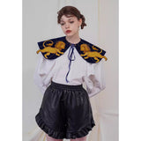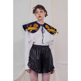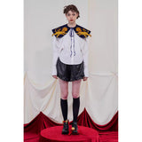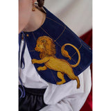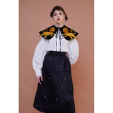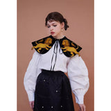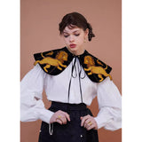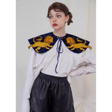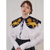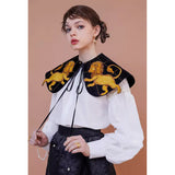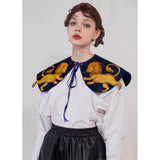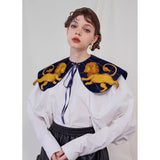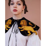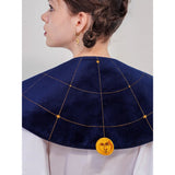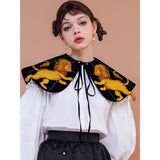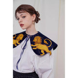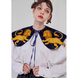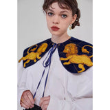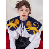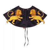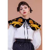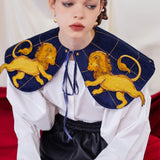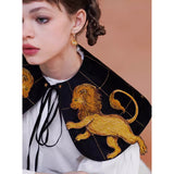金糸で紡いだ獅子の刺繍が鮮やかに映える付け襟。まるで星図と神話が融合したような存在感のあるアイテム。肩を大きく覆うケープ状のシルエットに、前面には躍動感ある獅子のモチーフ、背面には星々を結ぶ天球儀のようなラインと満ちた月の刺繍があしらわれています。