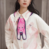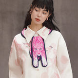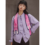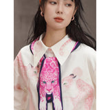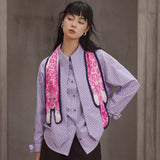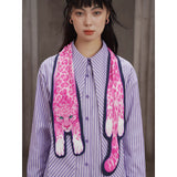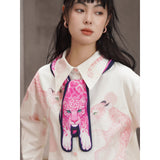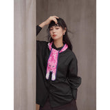 鮮やかなピンクの豹がそのまま首元に寄り添うように描かれた、存在感たっぷりのアーティスティックなネッカチーフ。なめらかな布の上に鮮烈な表情の豹がプリントされ、縁をダークカラーで引き締めた大胆なデザイン。スタイリングに唯一無二の遊び心とモード感を与えます。
