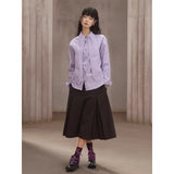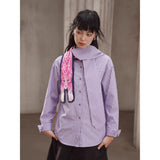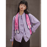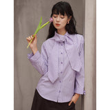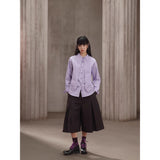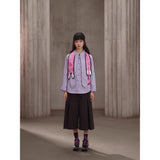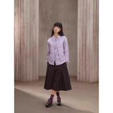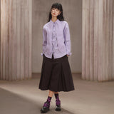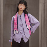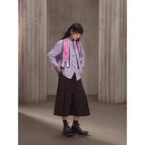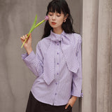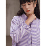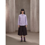 襟先を伸ばした独創的なデザインが特徴的なストライプブラウス。首元でリボンを巻いたり、首まわりに回し掛けたりすることで、視覚的なアクセントをお楽しみいただけます。袖口には小さなリボンが施されています。クラシックなシャツの端正さと、遊び心あるモード感を兼ね備えたアイテム。