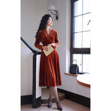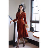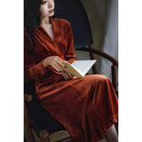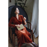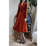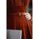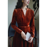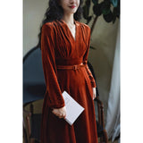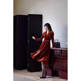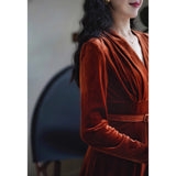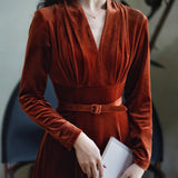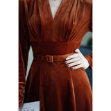 深みのある赤銅色のベルベットで仕立てられた、クラシカルで気品あふれるロングワンピース。胸元には柔らかく寄せたタックが流れ、Vネックのラインをより美しく際立たせながら、上半身に優雅な陰影を生み出しています。ウエストは同素材の細ベルトでキュッと引き締められ、たおやかな曲線を描くスカートへと滑らかに続きます。日常をひとつ格上げするような、静かな華やかさに満ちた一着。