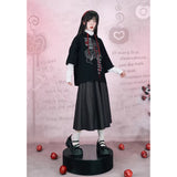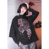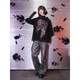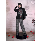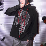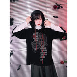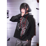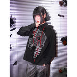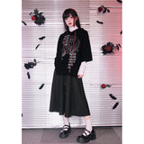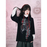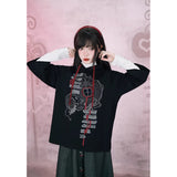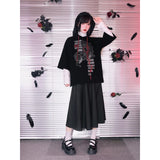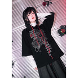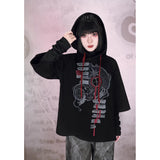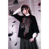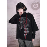 “禁断の果実”と“人間の原罪”をテーマにしたダークロマンをイメージさせる五分袖のフーディー。胸元には、頭蓋骨の内部に広がる思考や記憶を思わせるモチーフと、中心に配された赤い林檎の断面が重なり合い、理性と欲望、知恵と禁忌の象徴を描いています。そこから垂直に落ちる赤いラインは、禁断の果実をかじった瞬間に流れ出す運命や血の契約を暗示しているようにも見えます。放射状に広がる線は宗教画の後光を思わせ、神聖さと堕落が同時に存在する構図を生み出しています。