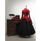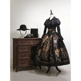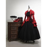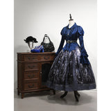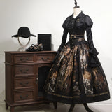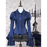 中世ヨーロッパの宮廷世界を想起させるブラウス。光沢のあるサテン生地は、舞踏会の灯りを受けて静かに輝く貴族の衣装を思わせ、胸元の繊細なギャザーとレース装飾は、王宮の装飾や古い写本の縁飾りのような気品を感じさせます。縦に並ぶ装飾ボタンがクラシカルな格式を強調し、ウエストを絞ったシルエットはコルセットドレスを連想させる優雅な曲線を描いています。袖口に重なる大きなフレアフリルは、まるで舞台で広がるドレスの裾や、貴婦人が優雅に手を振る瞬間の動きを切り取ったよう。背面の編み上げデザインは、ヴィクトリア朝の装束やゴシック様式の気配を宿し、前後どちらから見ても物語性を感じさせます。
