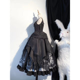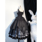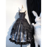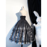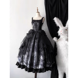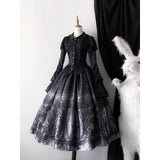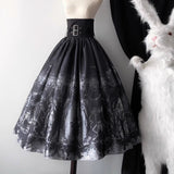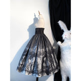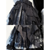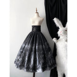 月明かりに照らされた禁断の森と、ゴシックな幻想物語を想起させるアイテム。絡み合う枯れ枝、静かに佇む古城、夜空に浮かぶ月影が描かれ、まるで深夜の森を彷徨う物語のワンシーンを閉じ込めたかのよう。グレーの配色は霧に包まれた廃墟の気配を漂わせます。ジャンパースカートはコルセット風の身頃とレイヤードされたオーガンジーが重なり、まるで闇の中で咲く黒薔薇のような立体感を演出。ウエストの構築的なラインは貴族的な気高さを感じさせ、ドラマティックなシルエットが舞台衣装のような存在感を放ちます。スカートは、広がる円形のラインによって夜の風景画をより純粋に際立たせ、シンプルでありながら物語性の強い一着に仕上がっています。