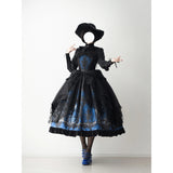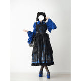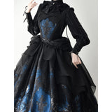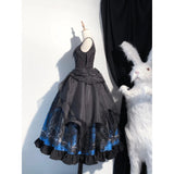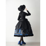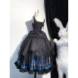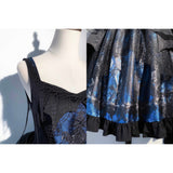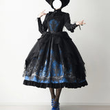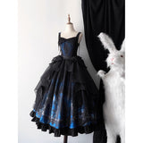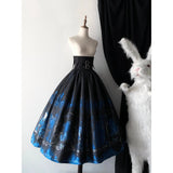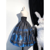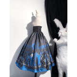 月明かりに照らされた禁断の森と、ゴシックな幻想物語を想起させるアイテム。絡み合う枯れ枝、静かに佇む古城、夜空に浮かぶ月影が描かれ、まるで深夜の森を彷徨う物語のワンシーンを閉じ込めたかのよう。ブルーの配色は月光に染まる静謐な夜を思わせます。ジャンパースカートはコルセット風の身頃とレイヤードされたオーガンジーが重なり、まるで闇の中で咲く黒薔薇のような立体感を演出。ウエストの構築的なラインは貴族的な気高さを感じさせ、ドラマティックなシルエットが舞台衣装のような存在感を放ちます。スカートは、広がる円形のラインによって夜の風景画をより純粋に際立たせ、シンプルでありながら物語性の強い一着に仕上がっています。