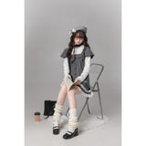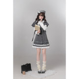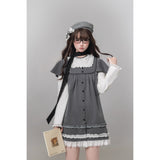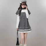 静かな午後にカフェや図書室で本を開く姿が自然と浮かび上がる。アンティーク調の少女らしさが漂うドッキングワンピース。グレーの細かなドット柄ジャンパースカートに、白の長袖インナーをドッキングしたような一着。肩をふんわりと覆うケープ風デザインと、胸元のレースカラーが清楚でクラシカルな雰囲気を醸し出しています。裾には幾重にも重なるレースフリルがあしらわれており、全体を可愛らしくまとめ上げています。