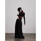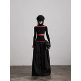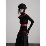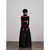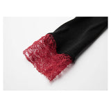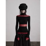 黒のタイトなシルエットに深紅のレースを大胆に組み合わせたアーティスティックなデザインのトップス。首元からウエスト、袖口にかけて赤のレースが透けるように配置され、肌と布地のコントラストが退廃的な美しさを醸し出しています。ボディラインを強調するリブ素材と、繊細なレースの質感が織りなすバランスは、冷たい静寂の中に宿る官能のよう。