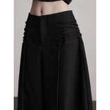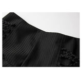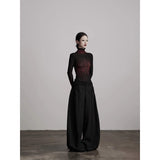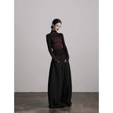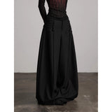 重厚感のある生地で構築されたアーティスティックなバルーンワイドパンツ。腰まわりにあしらわれた編み込みのコード装飾が、クラフト的な陰影と立体感を生み出し、細部まで緊張感のある造形を見せています。縦方向に走る微かなストライプと立体的なドレープが、動くたびに光を吸い込みながらゆるやかに揺れ、静謐で彫刻的な存在感を放ちます。