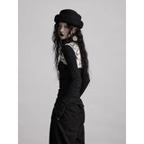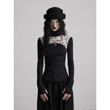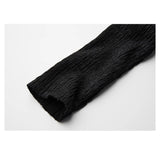 アートとモードが交錯するような構築的なデザインが印象的なハイネックトップス。上部には絵画の筆跡を思わせるモノトーンのスプラッター柄が施され、キャンバスのように白地に黒の軌跡が広がります。ボディ部分はシャーリングの効いたブラックファブリックで、身体にしなやかに寄り添いながらも彫刻的なフォルムを描きます。静謐なクラシシズムを漂わせ、全体に“静かに燃える芸術作品”のような存在感を与えています。