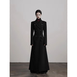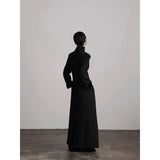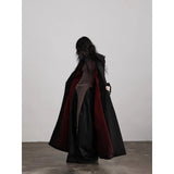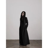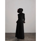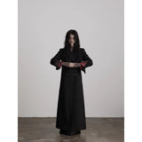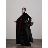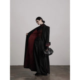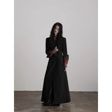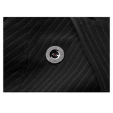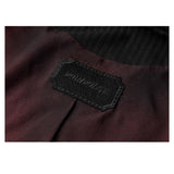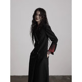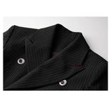 威厳と静謐を併せ持つロングテーラードコート。繊細なピンストライプが闇の中に微光のように走り、端正なシルエットが無言の強さを語ります。内側に潜む深紅の裏地が、静かな激情を秘めたように覗く。クラシックなダブルボタンと長いフォルムが、まるで貴族の影を現代に蘇らせたかのような一着。