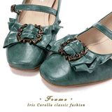クラシカルな時代の香りを纏うエレガントなメリージェーンパンプス。艶やかなレザーが上品に光を受け、スクエアトゥの端正なフォルムが知的で落ち着いた印象を与えます。フロントには柔らかなフリルとアンティーク調の金属バックルがあしらわれ、まるで古城の舞踏会に招かれた令嬢の足元のよう。二本のストラップが足をしなやかに包み、華奢なアンクルベルトが美しいシルエットを際立たせます。歩くたび、クラシックな旋律が響くような気品漂う一足。