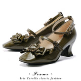 クラシカルな時代の香りを纏うエレガントなメリージェーンパンプス。艶やかなレザーが上品に光を受け、スクエアトゥの端正なフォルムが知的で落ち着いた印象を与えます。フロントには柔らかなフリルとアンティーク調の金属バックルがあしらわれ、まるで古城の舞踏会に招かれた令嬢の足元のよう。二本のストラップが足をしなやかに包み、華奢なアンクルベルトが美しいシルエットを際立たせます。歩くたび、クラシックな旋律が響くような気品漂う一足。