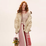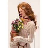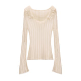 透明感と自由さを纏うような詩的なデザインのニットトップス。極細の糸で編まれた透け感のある素材が、空気を含むように軽やかに体に寄り添い、柔らかな陰影を描きます。緩やかなストライプの編み模様が縦のラインを強調し、ラフさの中にも繊細な美しさを感じさせます。袖口はやや長めで、指先まで包み込むようなシルエット。裾にかけての自然なドレープと、背中に流れるフードが、日常に少しの幻想を加えます。