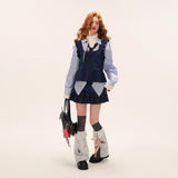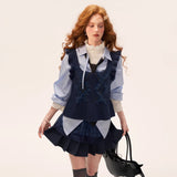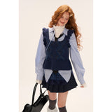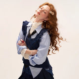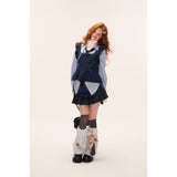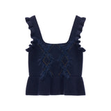 クラシックなアーガイル模様をフェザーのような糸で再構築した、繊細さと遊び心を併せ持つニットビスチェ。肩にあしらわれた小さなフリルがフェミニンな印象を添え、深みのあるネイビーの色調が上品な落ち着きを生み出しています。ウエスト部分はリブ編みでフィット感を出し、全体のシルエットを美しく引き締める設計。ブラウスの上から重ねることで、クラシカルでありながらもどこかモードなニュアンスを演出します。