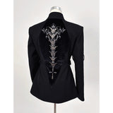 退廃的な美学を纏うゴシックジャケット。フロントはミリタリーテイストを基調としたシンプルかつ構築的なデザインで、スタイリッシュな立ち襟が特徴的。スリーブにはバックル装飾が施され、無機質な硬質感を演出しています。一方、背面は一転して妖艶なデザイン。背骨に沿って連なるゴシック調の脊椎パーツが視線を奪います。どこか神秘性と背徳感を漂わせる仕上がりとなっています。