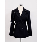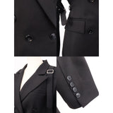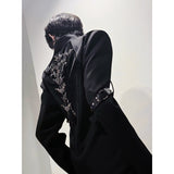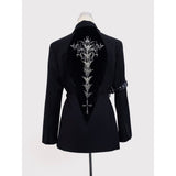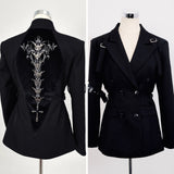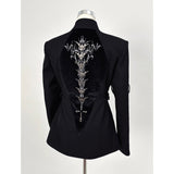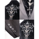 退廃的な美学を纏うゴシックジャケット。フロントは構築的なダブルブレストな仕様。スリーブにはレザーのバックル装飾が施され、無機質な硬質感を演出しています。一方、背面は一転して妖艶なデザイン。タトゥー調刺繍が浮かび上がり、背骨に沿って連なるゴシック調の脊椎パーツが視線を奪います。どこか神秘性と背徳感を漂わせる仕上がりとなっています。