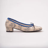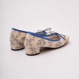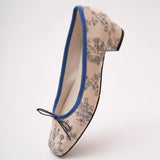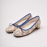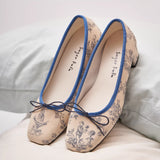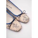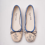静かな西洋の庭園で過ごす午後――噴水の音とともに流れる、優雅で少し物語めいた時間を描いたフラットシューズ。生成りの布地に描かれた繊細なブルーの線画は、庭園の彫像や花々、そこに佇む人物の情景を思わせ、まるで古い絵本や陶器の装飾に刻まれた一場面をそのまま写し取ったかのよう。縁を彩る深い青は、澄んだ水や空気の静けさを象徴し、全体に落ち着いた気品を与えています。