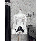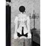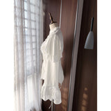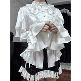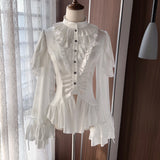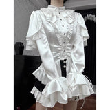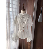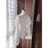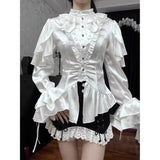 19世紀ヨーロッパの貴族令嬢の装いを現代的に再構築したかのようなブラウス。高めのスタンドカラーと胸元の重なり合うフリルは、ヴィクトリア朝のドレスシャツを思わせる気品を宿し、縦に並ぶ小ぶりなボタンがクラシカルな格式を静かに強調しています。ウエストは緩やかに絞られ、裾にかけて広がるペプラムラインがコルセットドレスのような優雅な曲線を描きます。袖は二重に重なるフリルスリーブと長いカフスフレアが印象的で、まるで宮廷舞踏会で優雅に手を差し伸べる貴婦人の仕草を連想させます。背面には編み上げデザインが施され、クラシカルなコルセットの要素を取り入れつつ、後ろ姿までも物語性を感じさせる構造となっています。