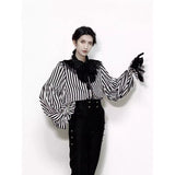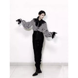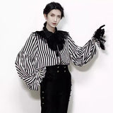 ゴシック貴族の衣装を思わせる印象的なブラウス。白黒のストライプ柄が視線を奪うこのブラウスは、ドラマティックな存在感を放ちます。肩から袖口へと大きく広がるボリュームスリーブが印象的。袖先のレース装飾が揺れるたびにダークロマンの余韻を漂わせます。