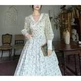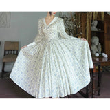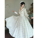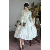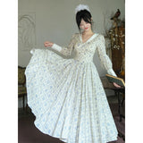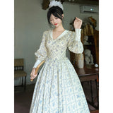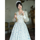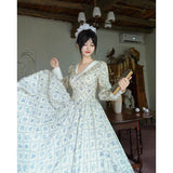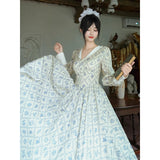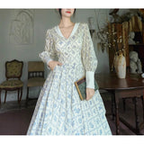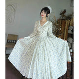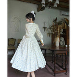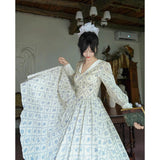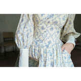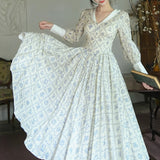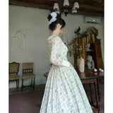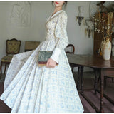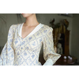 繊細な線が紡ぐ、18世紀のパリの庭園。フレンチレトロ調な優雅な雰囲気を持つワンピース。アイボリー地に繊細なブルーの植物・風景柄が描かれており、トワル・ド・ジュイを思わせるクラシカルな雰囲気。上半身は立体裁断で仕立てられ、ウエストラインを美しく見せてくれ、ハイウエストから放射状に広がる大きなフレアスカートは、たっぷりと生地を使用しており、美しいシルエットを醸し出しています。