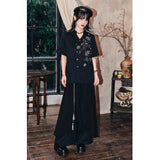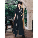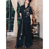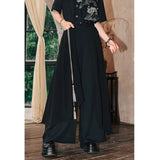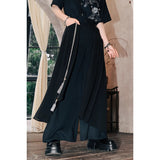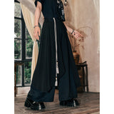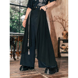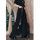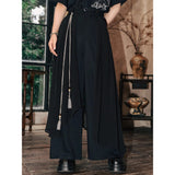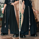 和のエッセンスとモード感を融合させたアシンメトリーなワイドパンツ。上からかかる揺れるような軽やかなレイヤード生地がスカートのような表情を生み出し、動きに合わせて流れるドレープが優美な印象を与えます。サイドには長く垂れた組紐風のタッセルがあしらわれており、和装の帯締めや根付を彷彿とさせるディテールがさりげないアクセントに。独自の世界観を持つコーディネートに映える存在感抜群のアイテム。