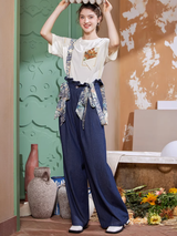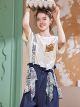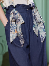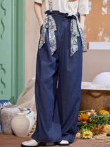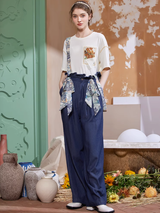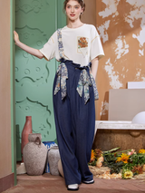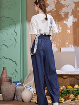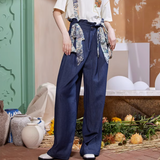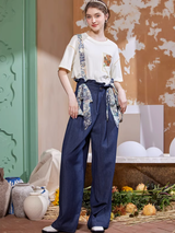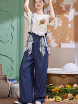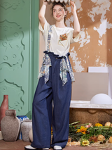 ゴッホの『農婦のいる古い葡萄畑』をストラップに描いたワイドデニムパンツ。深みのある青色でうねるように描かれたブドウ園と赤色で塗られていた屋根の色合いが美しい。お気に入りのTシャツと合わせて、カジュアルに着こなしてみて。