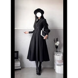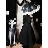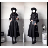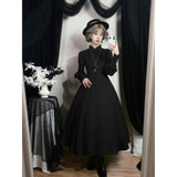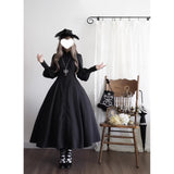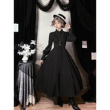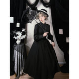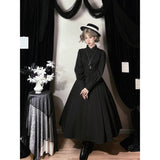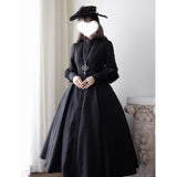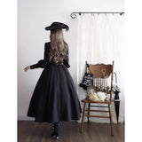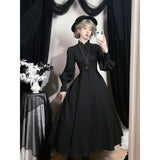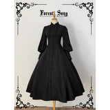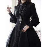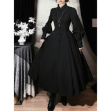 修道服や古いヨーロッパの喪服を思わせる厳粛さと、凛とした美しさを同時に湛えたワンピース。高く詰まった襟元から静かに立ち上がるようなデザイン。前身頃には縦に連なるくるみボタンと細かなピンタックが端正な雰囲気を醸し出しています。背面では編み上げのディテールが控えめながらも、存在感を主張しています。