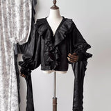 美しさと気品を兼ね備えた伯爵令嬢みたいに演出してくれるヴィクトリアンブラウス。フロント部分や襟元、袖口に存在感のあるフリルとラッフルが施されています。長いリボン状の袖口が特徴的で、動きが加わることで優雅で幻想的なシルエットを作り出します。滑らかな光沢を持つアイテム。ドラマティックでエレガントな雰囲気を放つお嬢様に。