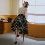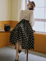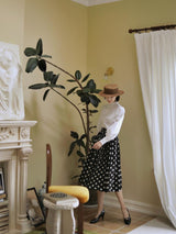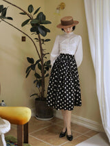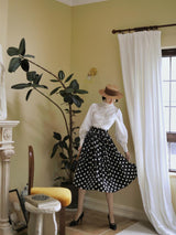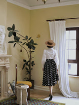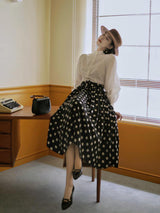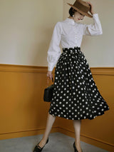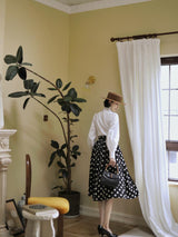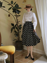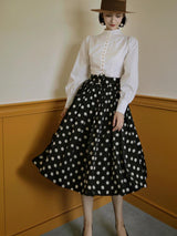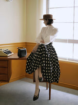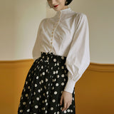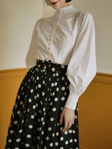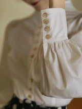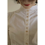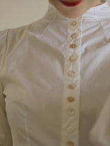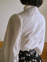 古き良き時代を彷彿とさせるクラシカルなハイネックブラウス。縦に一列に並んだボタン留めに目を奪われる。肩を張り出してボリュームを持たせたシルエットで、袖も比較的ゆったりとしています。ハイウエストなボトムスと合わせて、エレガントな貴婦人に。