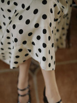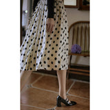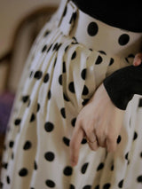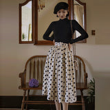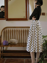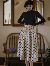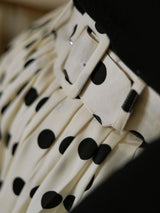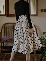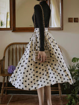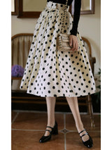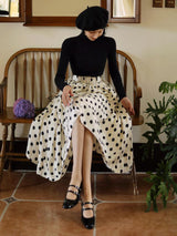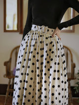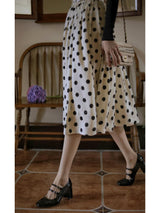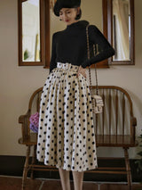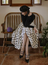 1950年代の映画女優みたいな雰囲気の水玉柄のアンブレラスカート。ふわっと広がるスカートと、幅が広いウエストバンドはレトロ感たっぷり。生地は厚手のサテンで、ドレープ性のあるマットな質感です。裏地はあり、ポケットはありません。クラシカルなブラウスを合わせて、エレガントな貴婦人に。