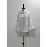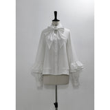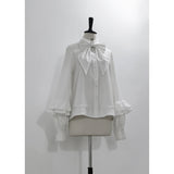 想像の物語を宿したドールみたいに演出してくれるゴシックブラウス。首元に存在感のある大きなリボンタイがついており、袖口はダブルフリルでボリューム感があり、華やかさを演出してくれる。立体的なディテールが圧倒的な存在感を放ちます。