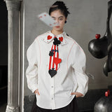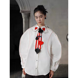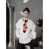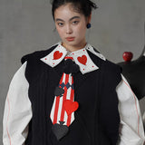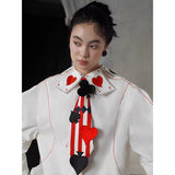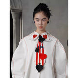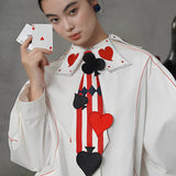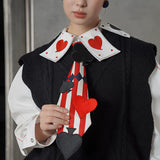 白地に鮮やかな赤のストライプが縦に走り、その上にハート、スペード、クローバーといったトランプのマークが立体的に配されたネクタイ。まるでトランプの絵札が静かに胸元へ落ち着いたかのよう。遊び心と緊張感が同時に漂う、クラシカルでありながらどこか挑発的な存在感を放っています。