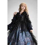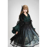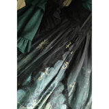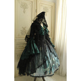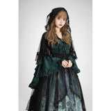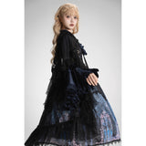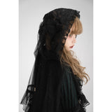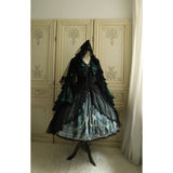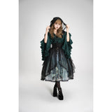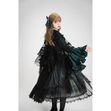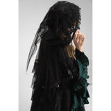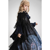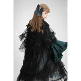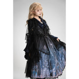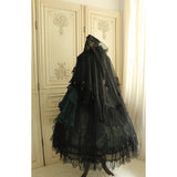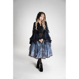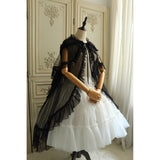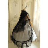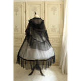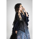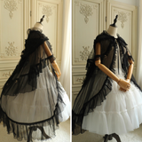ゴシックロマンスの夢をそのまま纏ったようなチュールマント。繊細な黒のチュールが幾重にも重なり、光を受けてかすかにきらめく様は、夜空に舞う黒蝶の羽のよう。縁取りのフリルは、古城のカーテンを思わせる優雅なカーブを描き、肩から裾にかけて流れるラインは、静かに降り積もる夜の帳を連想させます。まるで星を読む令嬢が身にまとっていそうな、ミステリアスで詩的な魅力を放つアイテム。