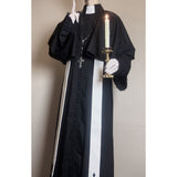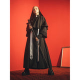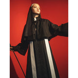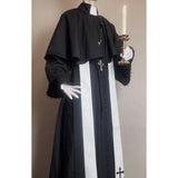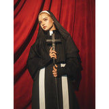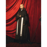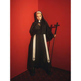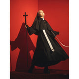 禁戒の神父みたいに演出してくれるアイテム。ロング丈のワンピースはハイネックなデザインで、袖口は広めで、繊細なレース刺繍が施され、手元を美しく飾ります。胸元から裾にかけて小さなボタンが並び、クラシカルな雰囲気を強調しています。ショールは、動きに合わせてやわらかく揺れ、神聖で厳かな印象を与えます。首からかけた長いストラには十字架が施されています。ゴシック的な荘厳さと、宗教的な厳粛さを備えた、存在感のあるアイテムに仕上がっています。