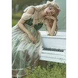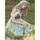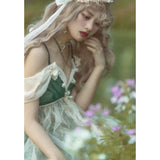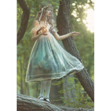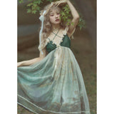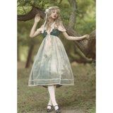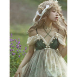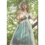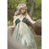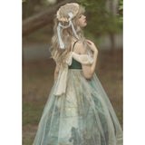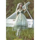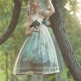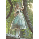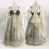 鬱蒼とした神秘の森を油彩画で描いたジャンパースカート。神々の息づかいが宿り、精霊たちが舞う静寂の世界。バックでリボンを結んだようなデザインで、透明感のあるチュール生地との二層構造となっています。深淵なる大地に誘われてみて。