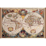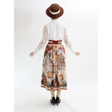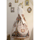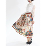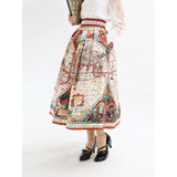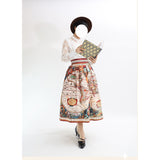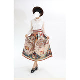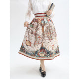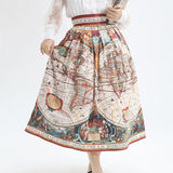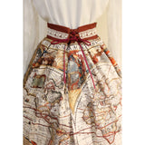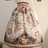 17世紀のアンティークな世界地図を大胆に描いたスカート。広がるフレアシルエットがエレガントで、クラシックな地図柄が存在感を際立たせます。ウエスト部分には繊細なレースや装飾が施されており、上品な印象を与えます。