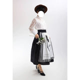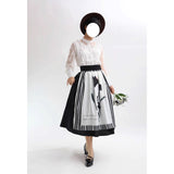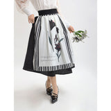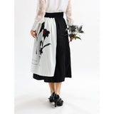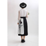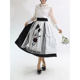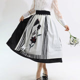 神秘的な香りを放つ闇夜の花。深い闇を湛えた黒百合の花を描いたスカート。白と黒を基調にした洗練されたデザインが特徴的。ストライプのディテールと、控えめなテキストのデザインも加わり、クラシカルな雰囲気を放っています。