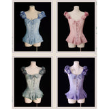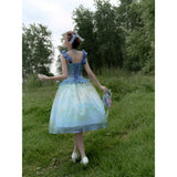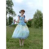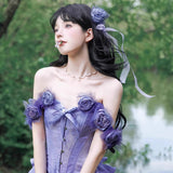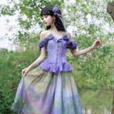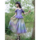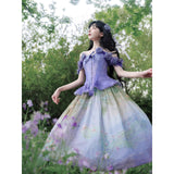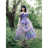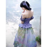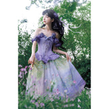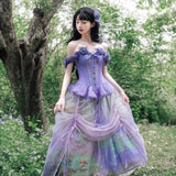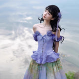 ヴィクトリア時代の庭園を歩く令嬢を彷彿とさせるビスチェとスカート。ジヴェルニーのモネの庭に咲いた睡蓮にオマージュを捧げるアイテム。ビスチェは薔薇の花が添えられたロマンティックなデザイン。オフショルダーのラインとウエストの切り替えがクラシカルな雰囲気を高め、背面はレースアップ仕様でシルエットを美しく整えます。スカートは、ふわりと重ねられたチュールが光を受けて柔らかく揺れます。やわらかな光に満たされた美しき風景は幻想的。